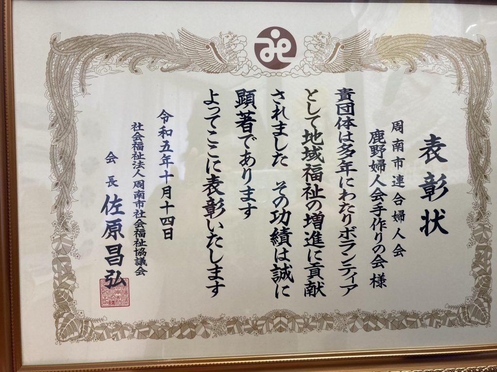 鹿野婦人会手作りの会が表彰されました 2023.10.30 多年にわたるボランティア活動が評価され、周南市社会福祉協議会より表彰状が授与されました。 鹿野文化祭に参加 前の記事 山口県連合婦人会70周年記念大会 次の記事
